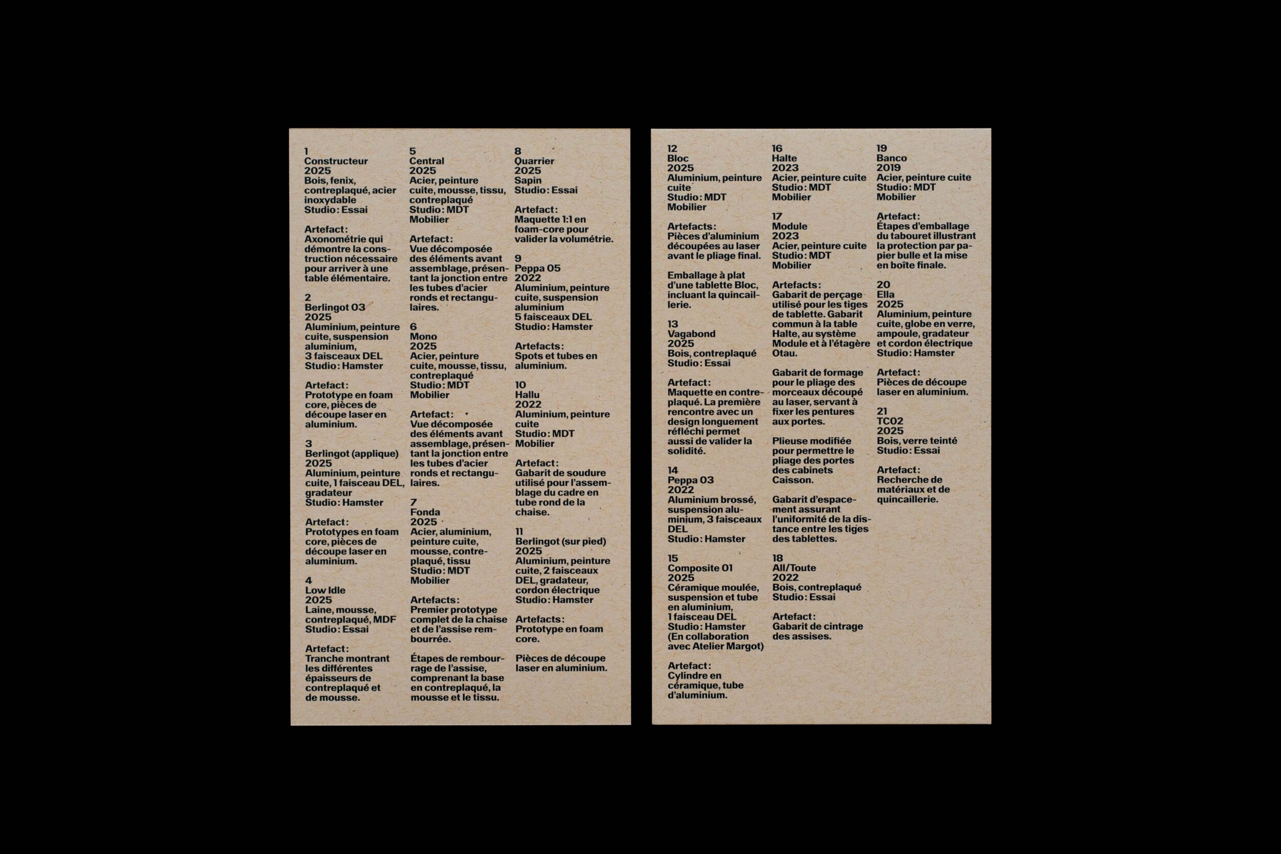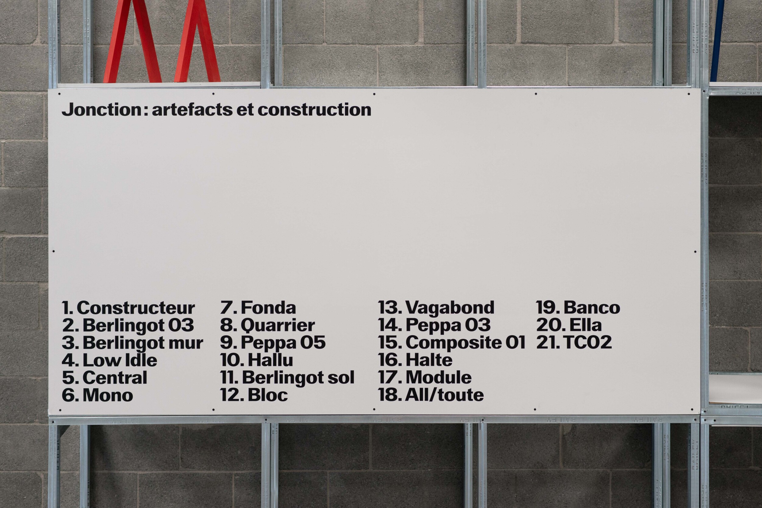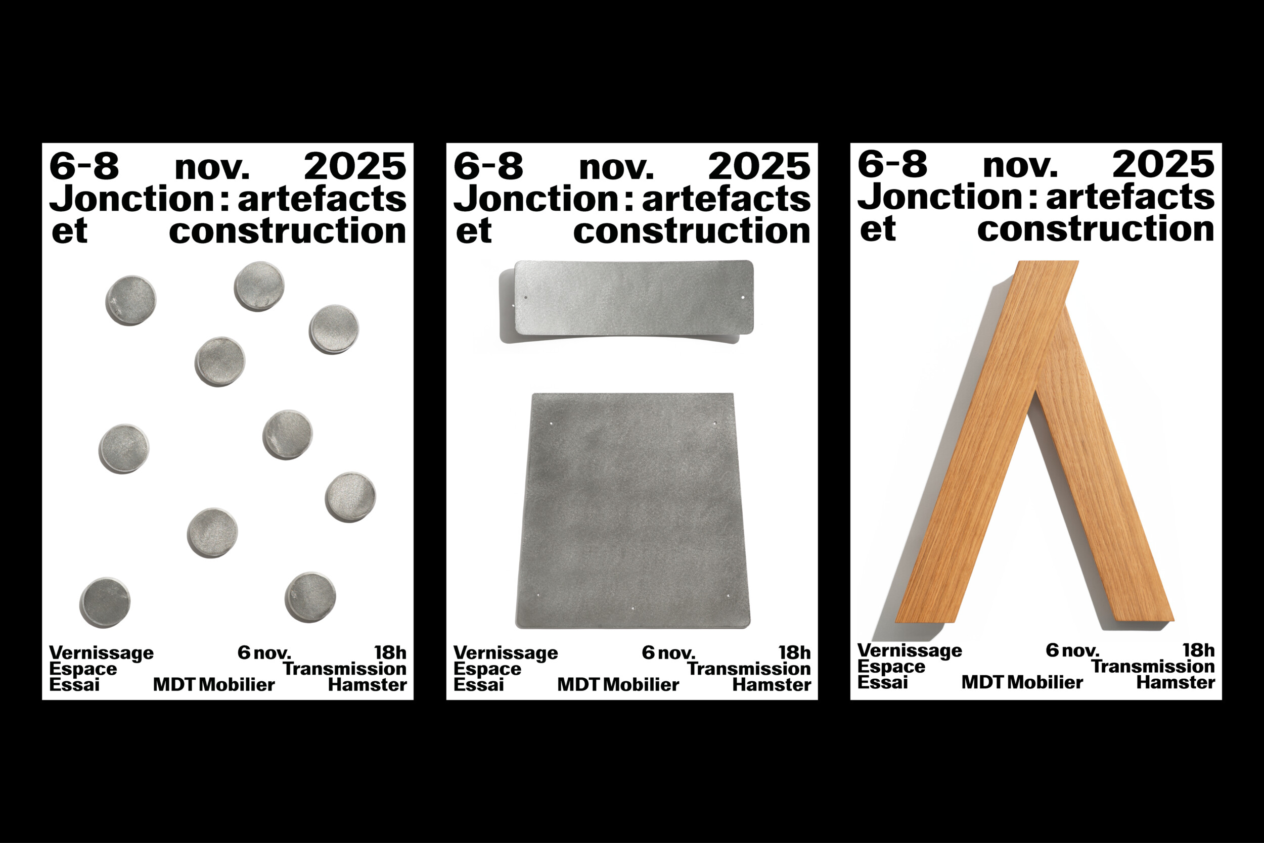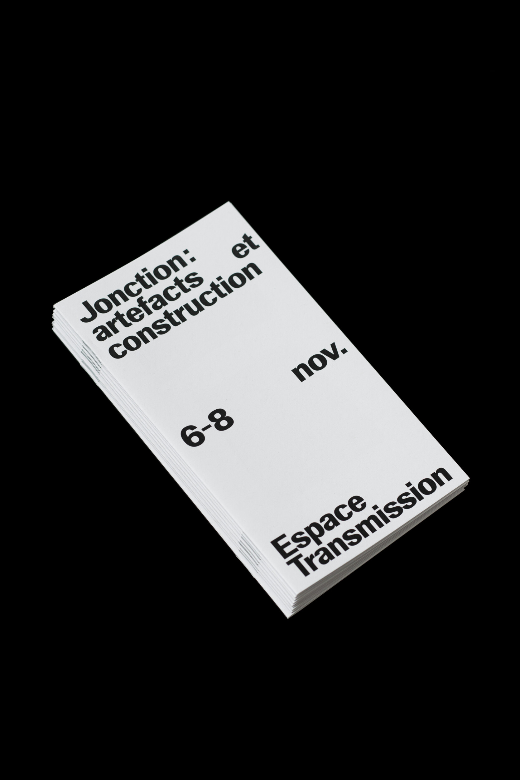 Identité pour l’exposition Jonction. Organisée par trois studios de design, l’exposition Jonction a été présentée à l’Espace Transmission à l’automne 2025. À travers un parcours combinant mobilier, prototypes, maquettes et gabarits, Jonction met en lumière les étapes intermédiaires de production habituellement inaccessibles au public.