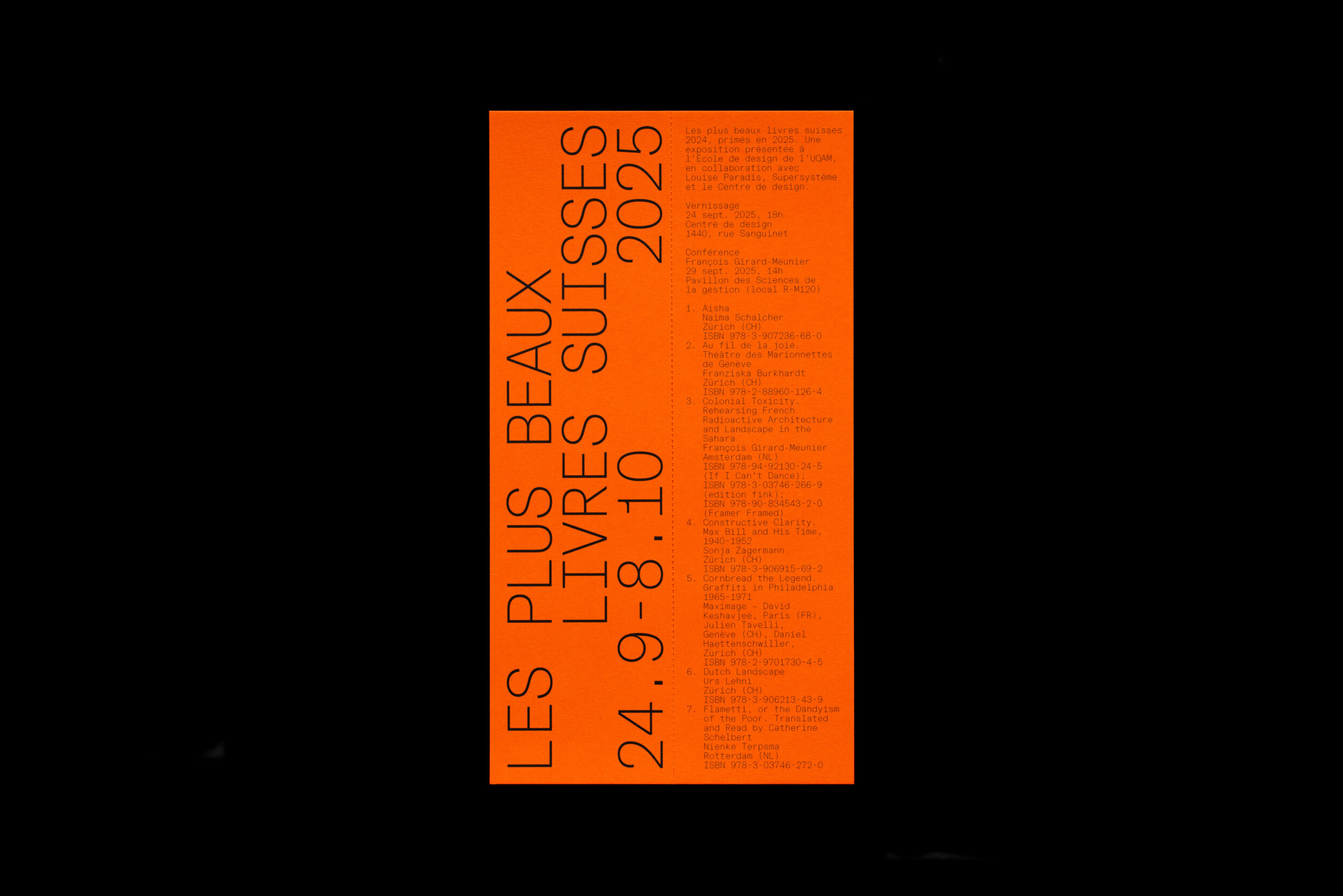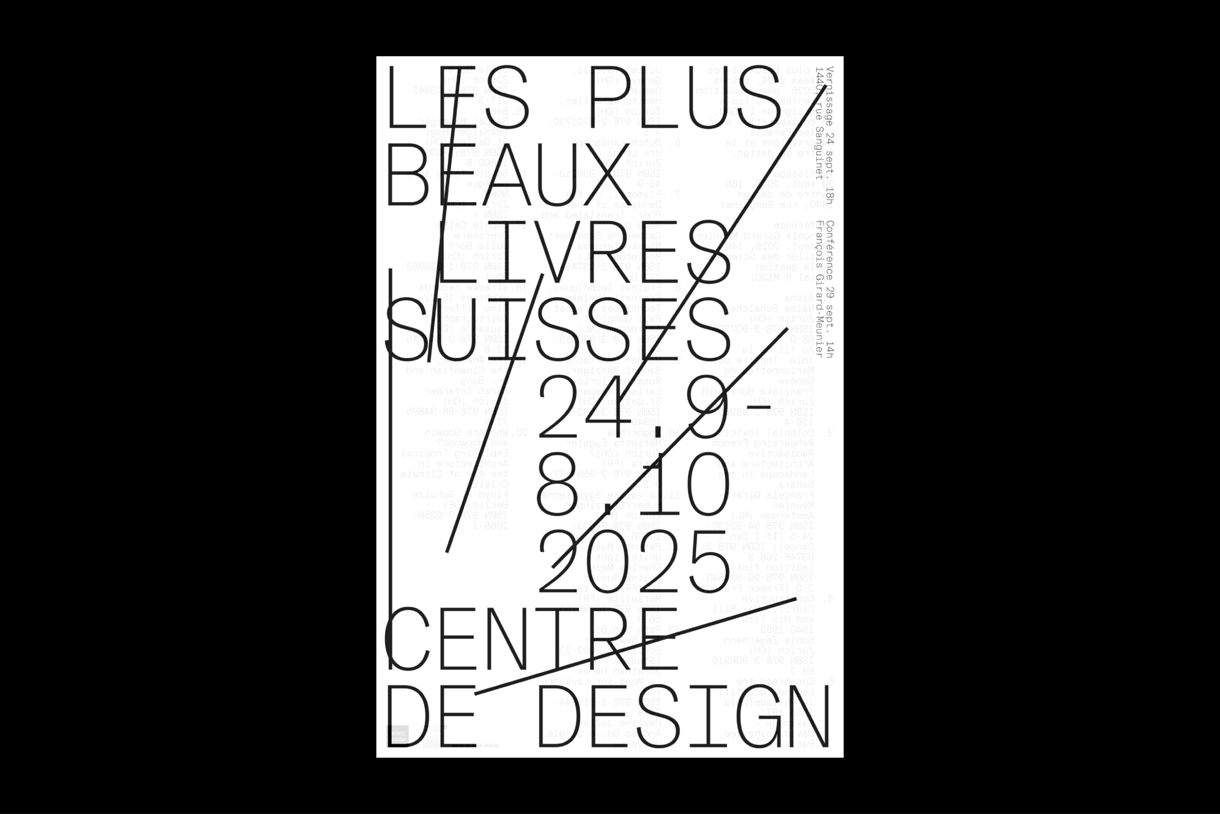 Identité pour l’exposition Les plus beaux livres suisses. Organisée par l’Office fédéral suisse de la culture, ce concours distingue des réalisations particulièrement abouties dans la production et l’art du livre et met en lumière des ouvrages qui expriment les tendances contemporaines. L’exposition Les plus beaux livres suisses a été présentée à l’École de design de l’UQAM à l’initiative de la professeure Louise Paradis.