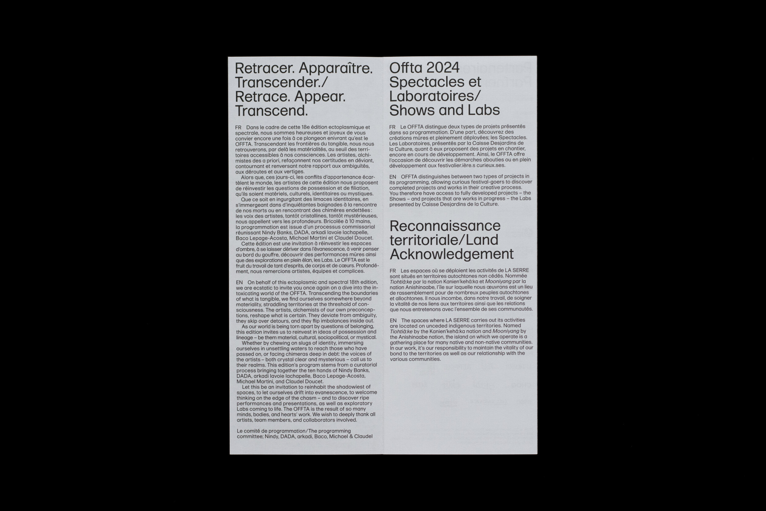 Identité visuelle et site web de la 18ième édition du Festival d’arts vivants OFFTA. Le OFFTA est un festival voué à la création d’avant-garde en arts vivants. Il a pour mission de défricher, tout au long de l’année, le paysage artistique local afin de mettre de l’avant des créateurs dont la démarche guide les nouveaux courants en théâtre, en danse et en performance. Programmation par Patrick Thériault